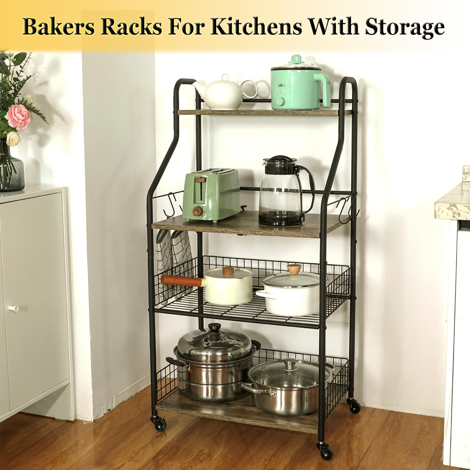 Bakers Racks For Kitchens With Storage 5 S Hooks 4 Tier Rolling Microwave Cart Stand Coffee Bar Table Station With Shelves Wire Basket Kitchen Organization Shelf Rack For Fruit Vegetable Spice Home Kitchen Amazon Com